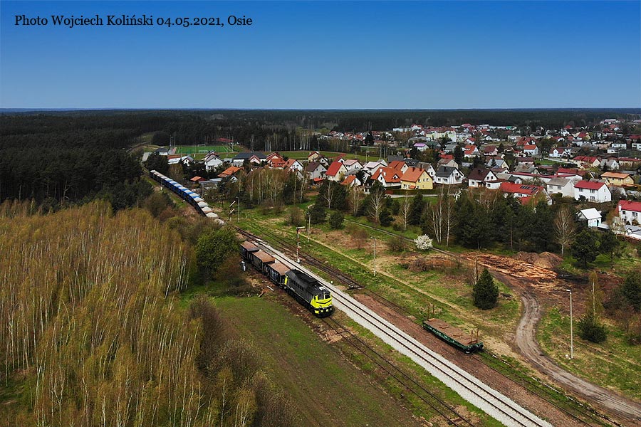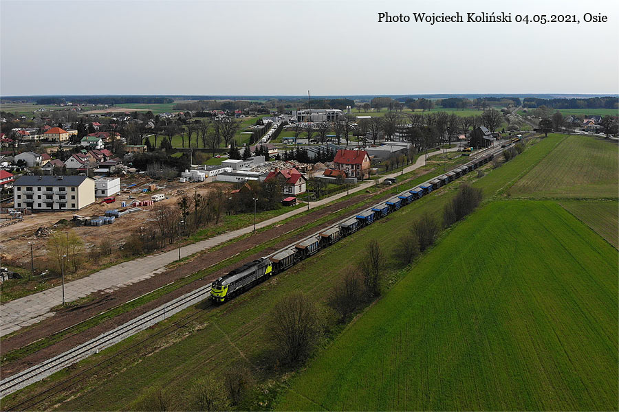 Pomorskie Przedsiebiorstwo Mechaniczno-Torowe (PPMT) M62-1705 pushes the train with crushed stone near the Lazek stop 04.05.2021, Osie Photo W. Kolins |