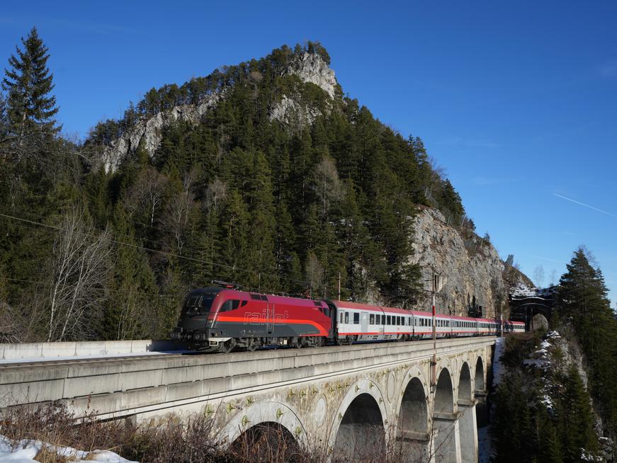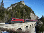 | A-ÖBB 91 81 1216 020-8 in front of a railjet, Krauselklauseviadukt near Breitenstein. 2026-01-14. |