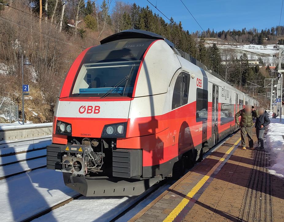 | A-ÖBB 94 81 4746 553-8 (VOR branding) on the line R91 from Mürzzuschlag to Payerbach-Reichenau, stopping at Breitenstein. 2026-01-14. |