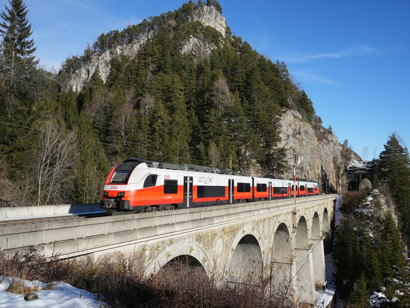 | A-ÖBB 94 81 4746 553-8 (VOR branding) on the line R91 from Mürzzuschlag to Payerbach-Reichenau, crossing the Krauselklauseviadukt near Breitenstein. 2026-01-14. |