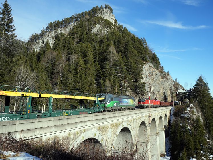 | D-ELOC 91 80 6193 249-9 (ELL / RTB Cargo / ARS Altmann) with a train of empty automobile carriers meeting a freight train pulled by the A-ÖBB 91 81 1144 283-9 and an unidentified class 1016/1116. Krauselklauseviadukt near Breitenstein. 2026-01-14. |