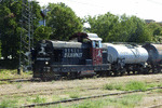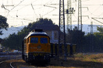 A private diesel locomotive with number 92 52 00 07 151 - 0, owned by private operator Euro Engineering at railway station Vakarel with work train.