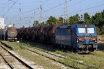 A private electric locomotive with number 91 53 0 40 0409 - 5, owned by private operator BRC ("Bulgarian Railway Company") at railway station Iliyantsi, after pulling a freight train.