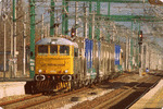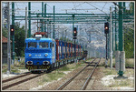 A private electric locomotive with number 91 52 00 85 608 - 5, owned by private operator "Rail Net Cargo" at railway station Pazardjik with freight train.