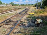 A private diesel locomotive with number 92 52 00 07 264 - 1, owned by private operator "Euro Engineering" cross through railway station Pazardjik with work train. A video about crossing, you can see here: