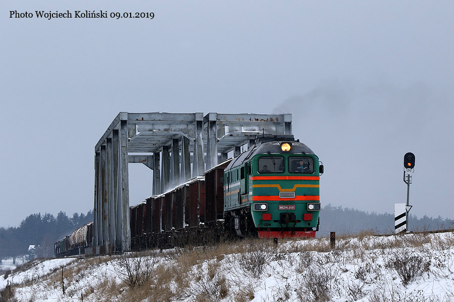 Belarusian Railways (Belaruskaja Czyhunka) M62UK-3101 with the freight train Siemianowka - Swislocz (Belarus) 09.01.2019, track Siemianowka - Cisowka Photo W. Kolins |