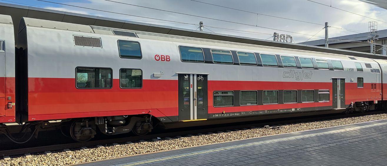 | A-ÖBB 50 81 26-33 531-6 Bmpvz, doubledeck middle car in cityjet livery with VOR branding. Wien Praterstern, 2026-02-13. |
