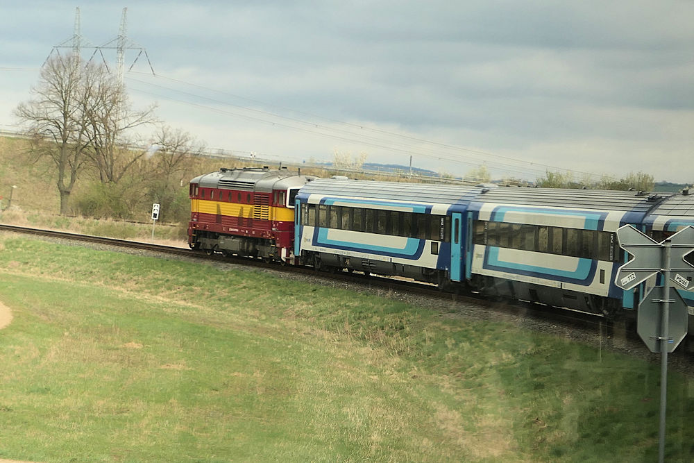 CD - Czechia Today EuroCity 130/131 from Warsaw to Budapest makes a detour because of track works. Between Rohatec and Kuty the very uncommon border crossing at Sudomerice nad Moravou is used. From Rohatec to Sudomerice the train is operated by diesel locomotive 750 705 in historic red-yellow livery. Sudomerice nad Moravou, 04-04-2026 Photo by Marco van Uden |