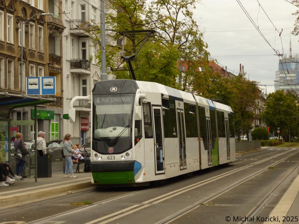 Moderus Beta No. 623 on route 4 at Plac Szarych Szeregow, Szczecin, Poland, 10.09.2024.