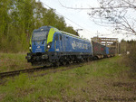 PKP Cargo ET43-003 with a rake of Black-Box-Xpress containers loaded with foundry coke to Germany is passing Rebiszow, Lower Silesia, Poland, 27.04.2026.
