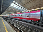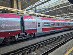 A high speed EMU TGV PBKA, in Thalys color scheme, owned by SNCF ("Societe Nationale des Chemins de fer Francais / French Railways") at railway station Bruxelles Midi, using an international train to Paris Nord.