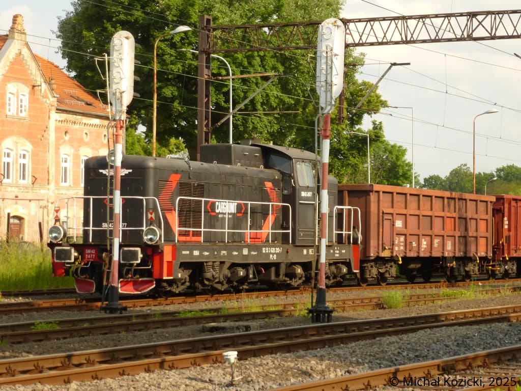 FDM-REW Damian Zur SM42-2477 hired from Cargounit with a rake of open wagons to be loaded with aggregate stands idle in Luban Slaski, Poland, 03.06.2025.