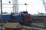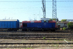 A private diesel shunter with number 98 52 00 55 816 - 3, owned by private operator "Port Rail" at central railway station Burgas shunting with freight cars.