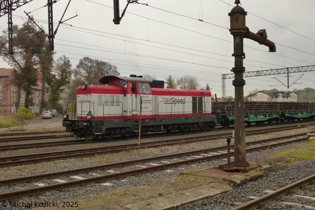 Trainspeed SM42-044 with a rake of flat wagons loaded with wooden railway sleepers is seen standing in Luban Slaski, Poland, 21.10.2025.