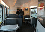 | Presentation of first modernized railjet 2025-11-20 at Wien Autoreisezug station. The railjet unit 47 was the first to be completely refurbished. Besides a technical overhaul the seats in first and second class were replaced and surfaces renewed. Restaurant with grey bench seats in the usual arrangement, just the colour has changed. |