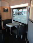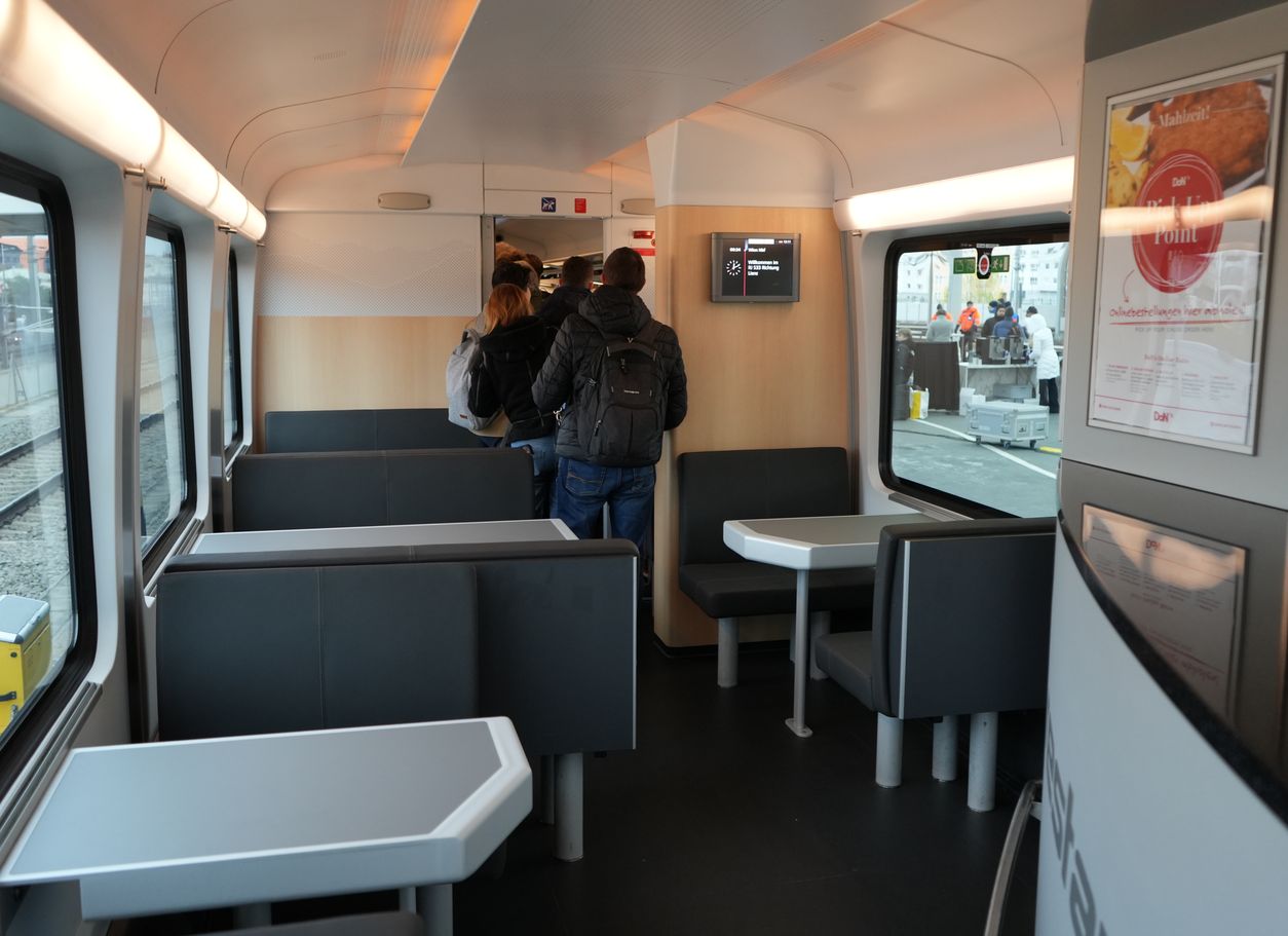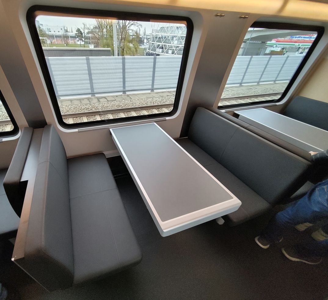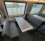 | Presentation of first modernized railjet 2025-11-20 at Wien Autoreisezug station. The railjet unit 47 was the first to be completely refurbished. Besides a technical overhaul the seats in first and second class were replaced and surfaces renewed. Second class seats around a table. |