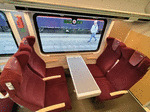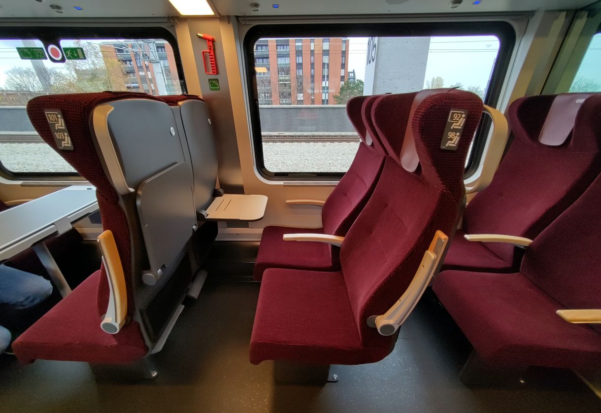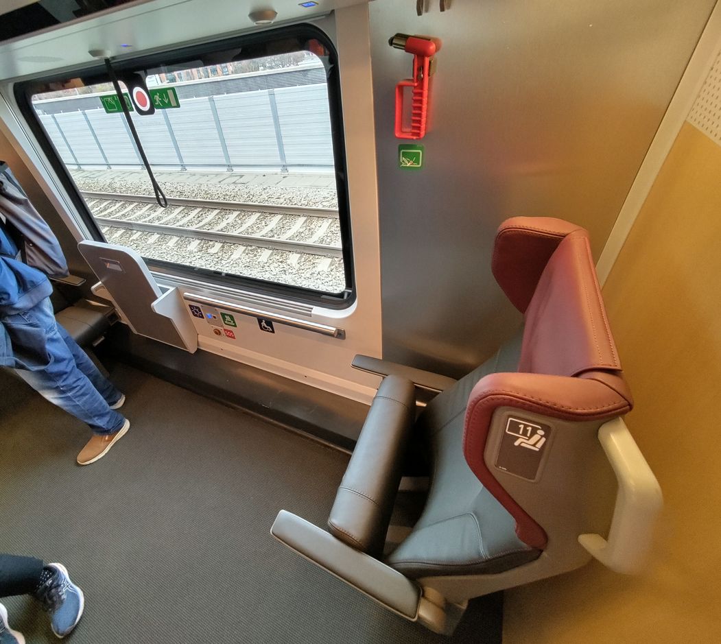 | Presentation of first modernized railjet 2025-11-20 at Wien Autoreisezug station. The railjet unit 47 was the first to be completely refurbished. Besides a technical overhaul the seats in first and second class were replaced and surfaces renewed. Here you see first class seats at a table. The seats are adjustable, though the headrests always remain in one place. There are two electric plugs under the seats. |