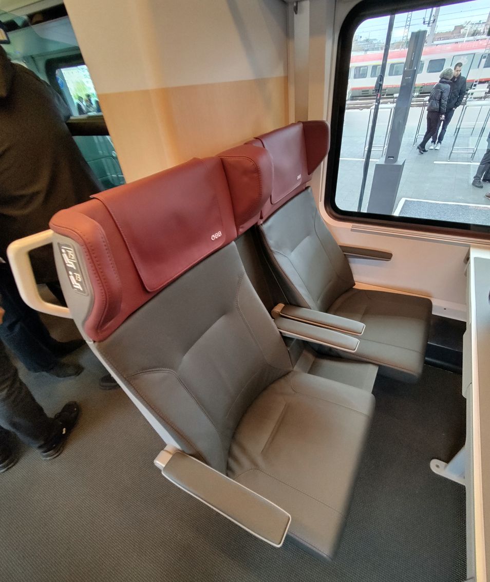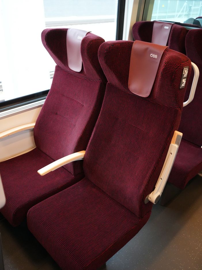| Presentation of first modernized railjet 2025-11-20 at Wien Autoreisezug station. The railjet unit 47 was the first to be completely refurbished. Besides a technical overhaul the seats in first and second class were replaced and surfaces renewed. Second class double seat. |