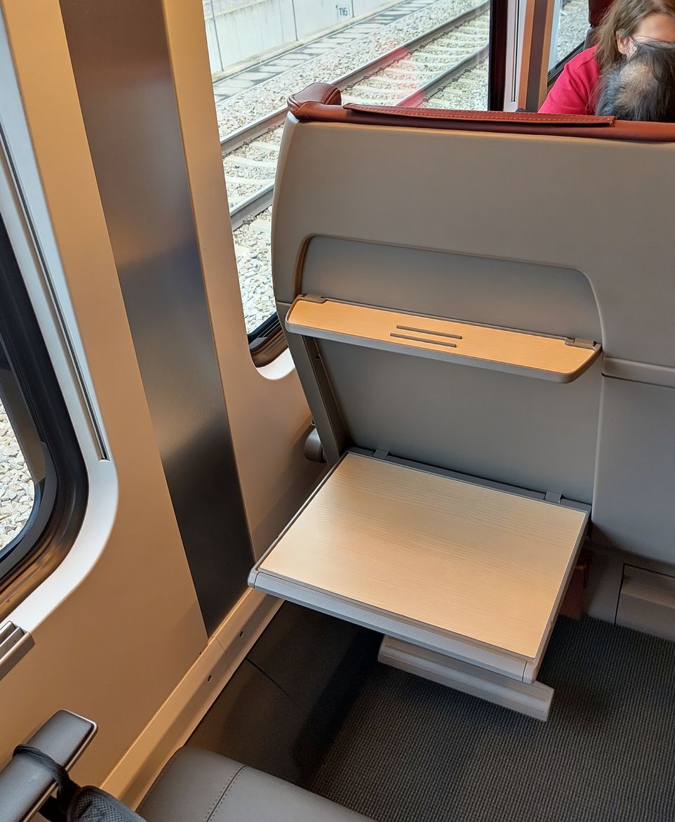 | Presentation of first modernized railjet 2025-11-20 at Wien Autoreisezug station. The railjet unit 47 was the first to be completely refurbished. Besides a technical overhaul the seats in first and second class were replaced and surfaces renewed. Back of first class row seats with an extendable table, small extra holder for mobile devices and footrest. |