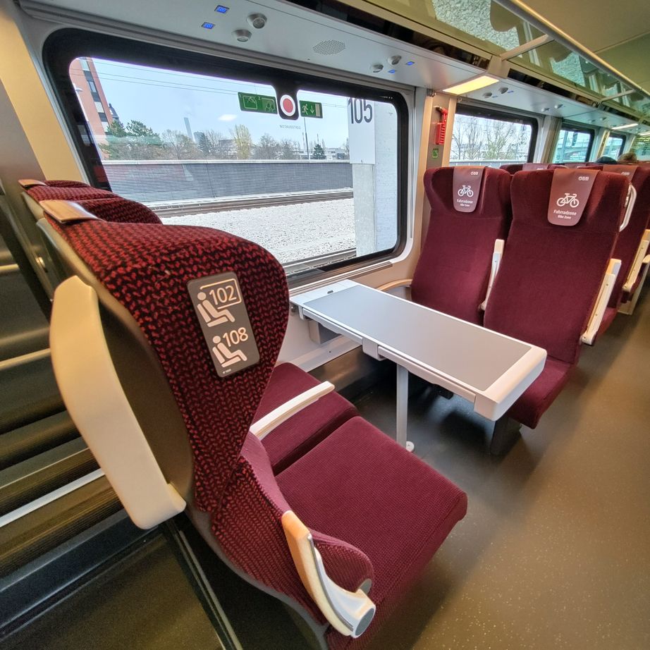 | Presentation of first modernized railjet 2025-11-20 at Wien Autoreisezug station. The railjet unit 47 was the first to be completely refurbished. Besides a technical overhaul the seats in first and second class were replaced and surfaces renewed. Second class seats with tables for passengers with bicycles. |