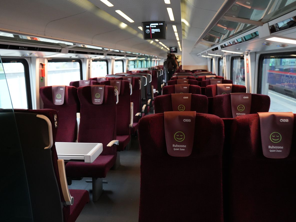 | Presentation of first modernized railjet 2025-11-20 at Wien Autoreisezug station. The railjet unit 47 was the first to be completely refurbished. Besides a technical overhaul the seats in first and second class were replaced and surfaces renewed. Second class seats back to back with some luggage space underneath. |
