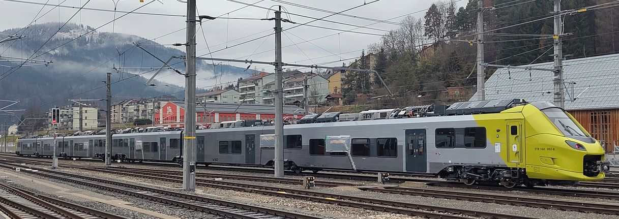 | ETR 160 002-A/B in Mürzzuschlag, with some cables taped to the outside and going into windows, indicating the unit is here for test runs probably on the Semmering line. The six-car unit consists of carbodies numbered 94 83 4160 021-1, 022-7, 023-2, 024-3, 025-0 and 026-0 of I-SAD. This is one of 15 units ordered by SAD/STA, with 8 more of the same type to be delivered to ÖBB (class 4160 would fit into the Austrian system). The units have 381 seats, a power of 3000 kW, reach a speed of up to 160 km/h and are capable of running in Austria and Italy, with one Austrian and two Italian pantographs on the roof. They will operate trains between Innsbruck, Lienz, Bolzano/Bozen, Merano/Meran and Malles Venosta/Mals starting december 2026. |