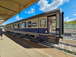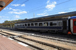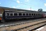A second class passenger car of CFR (Caile Ferate Romane / Romanian Railways) type "B11mee" at central railway station Ruse in composition of International train with number 461 from Bucuresti Nord to Sofia.This car has a destination Bucuresti Nord - Varna and moves only during the summer.
