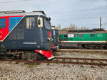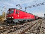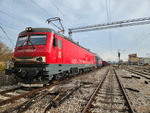 A private electric locomotive Softronic Transmontana with number 91 53 0 480 016 - 1, owned by private operator "DB Cargo Romania" at railway station Nis with freight train.