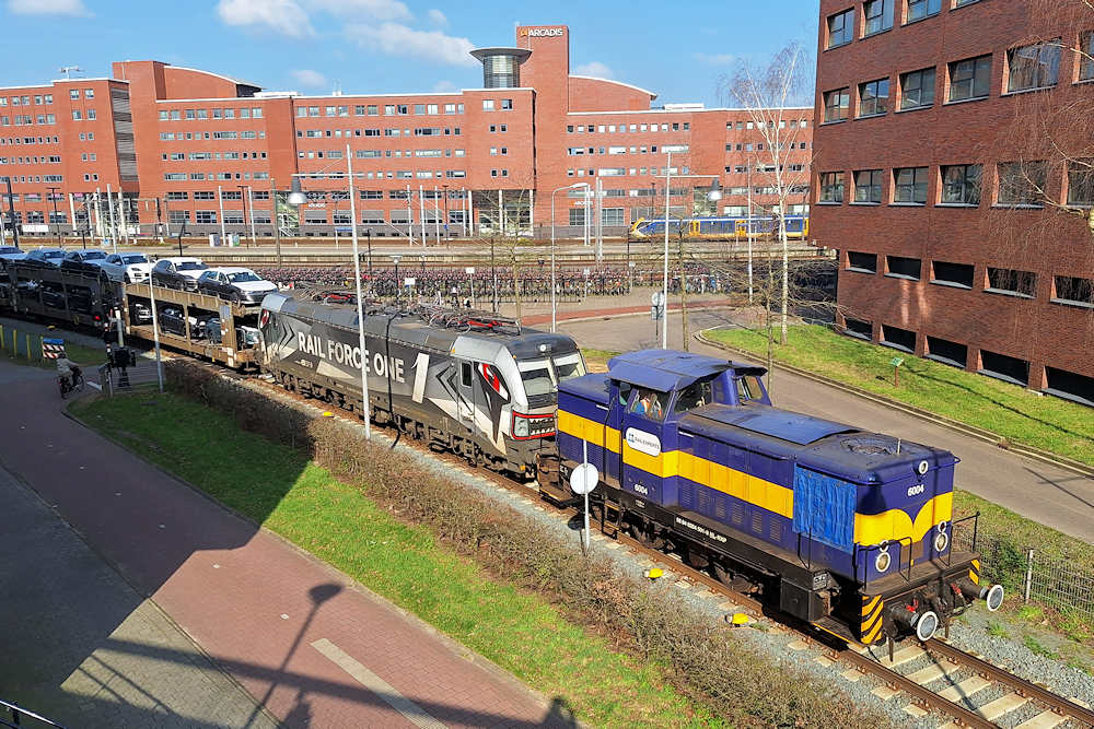 RXP - The Netherlands Former GDO class V60D diesel shunter 6004 with RFO Vectrom electric locomotive 193 949 dead-in-train depart with a loaded car train from Amersfoort Centraal towards Leusden. Amersfoort, 07-03-2024 Photo by Marco van Uden |