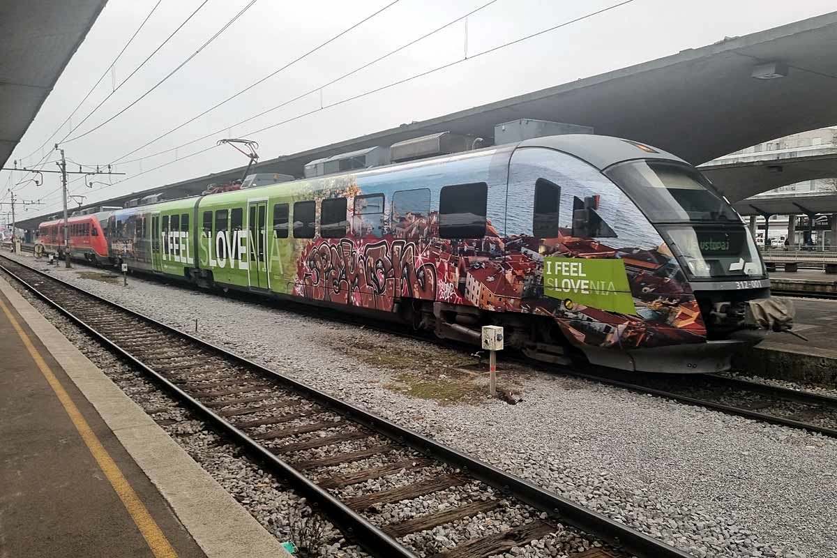 SZ Slovenske Zeleznice Slovenian Railways EMU-2 Class 312 nr. 312-001 in graffitted special I FEEL SLOVENIA colors at Ljubljana Central Station. 06/02/2024.