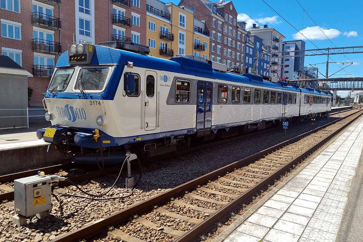 Swedish local operator Transitio old EMU-2 Class X11B nr. 3174 (NVR 94 74 511 3174-4 S-ABTR) waiting between services on track 4 at Vaxjo Station. 25/06/2024.