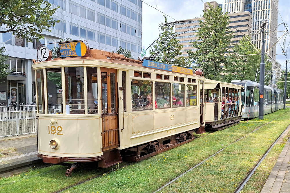 Stichting RoMeO/RET - The Netherlands Historic tram 834 used on Citytour line 10, is ready to depart from starting point Willemsplein. Behind it is tram 368 that will be used in half an hour. Rotterdam, 03-08-2024 Photo by Marco van Uden |