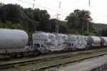 A freight car "Sggmrs" of TCDD (Turkiye Cumhuriyeti Devlet Demiryollari / Turkish Railways) at railway station Iskar in composition of freight train.