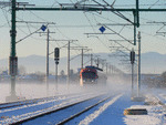 An electric locomotive SIEMENS Smartron of class 80-00 near railway station Pazardjik with fast train with number 8610 from Burgas to Sofia via Plovdiv.