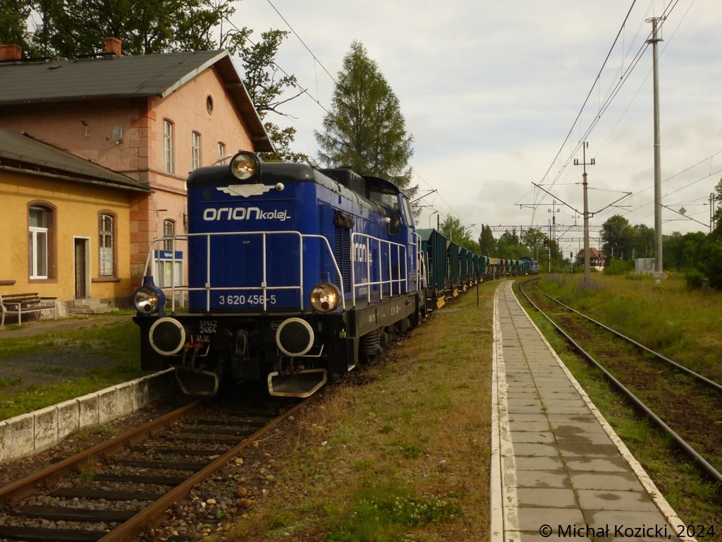 Orion Kolej SM42-2464 with a rake of empty ballast hoppers is arriving in Rebiszow, Poland, 20.06.2024.