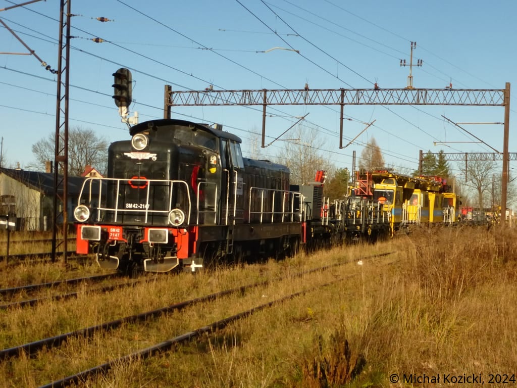 Service and Logistics Group (SLG) SM42-2147 hired from Cargounit is seen stabled in Rebiszow with catenary maintenance vehicle PS-00.M/B No. 47, Lower Silesia, Poland, 01.12.2024.