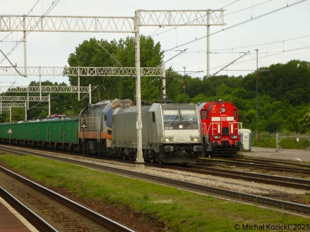 IGL E483 225 and 311D-16, both leased from Akiem, prepare to leave Katy Wroclawskie with a rake of open wagons loaded with aggregate, Poland, 31.05.2025.