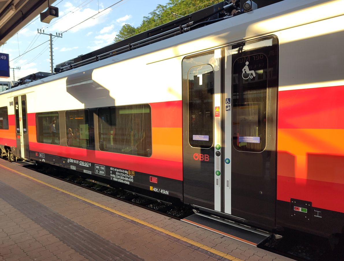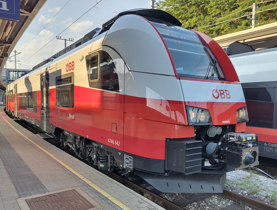 | A-ÖBB 94 81 4746 642-9. Line S8 Bruck an der Mur to Unzmarkt. This unit does not have a "cityjet" inscription like most of the series. On one end a section with 12 seats is reserved for first class. Later in 2025 these units will operate Interregio services, while operating as S-Bahn the first class is open to all without surcharge. Bruck an der Mur, 2025-08-09. |