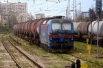 A private electric locomotive with number 91 52 00 85 608 - 5, owned by private operator "Rail Net Cargo" at railway station Pazardjik with freight train.