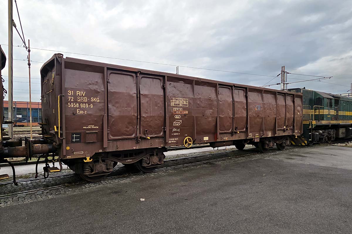 Serbian ZS(SV/SKG) Zeleznice Srbije freight car type Eas-z NVR 31 72 59-58 909-9 SRB-SKG RIV at Beograd Ranzirna Freight Yard. 03/12/2025.