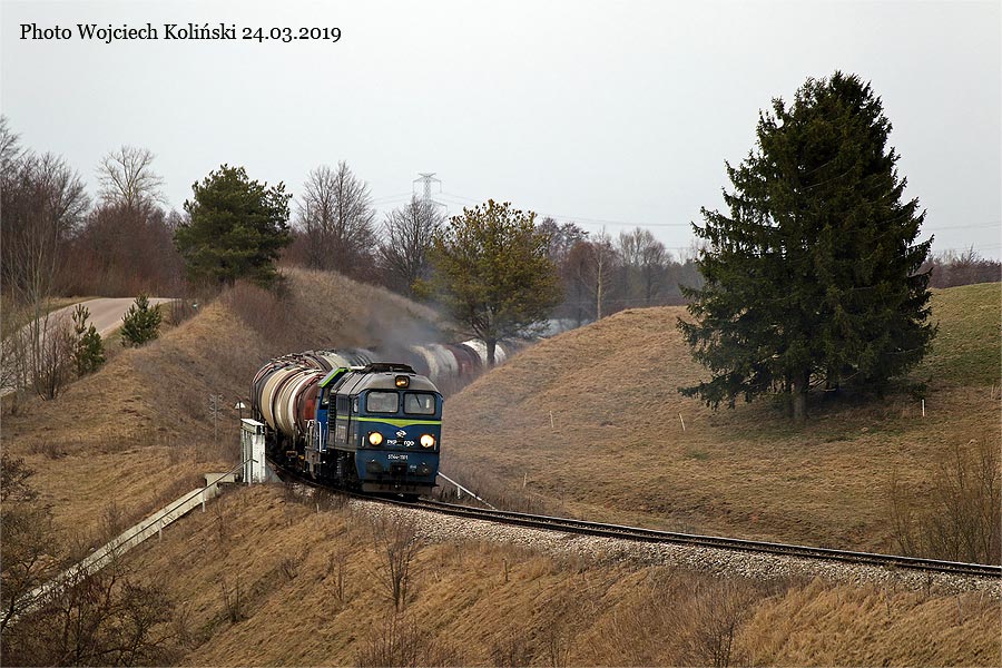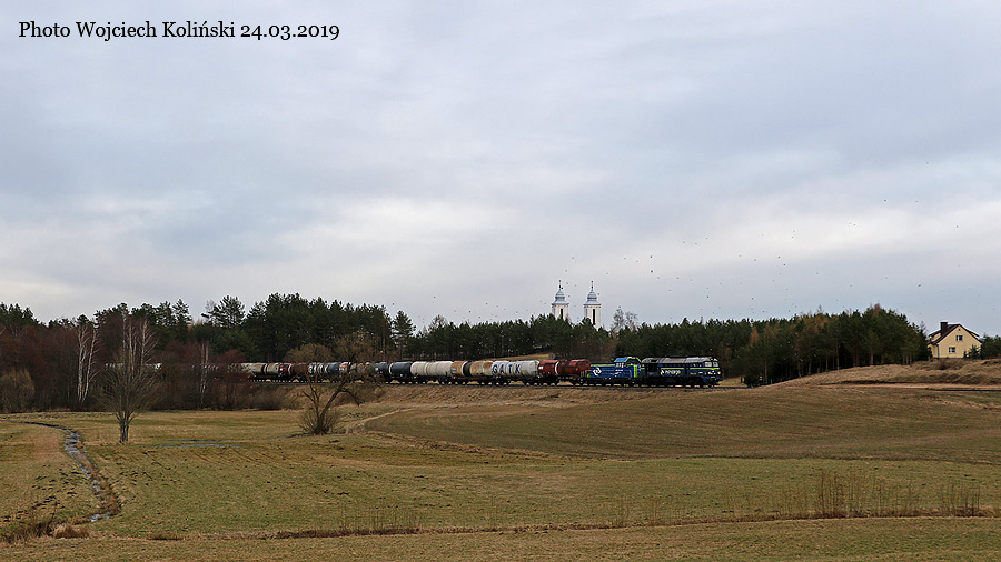 PKP Cargo ST44-1101 + SM42-1273 with the freight train Mockava (Lithuania) - Suwalki 24.03.2019, track Okuniowiec - Suwalki Photo W. Kolins |