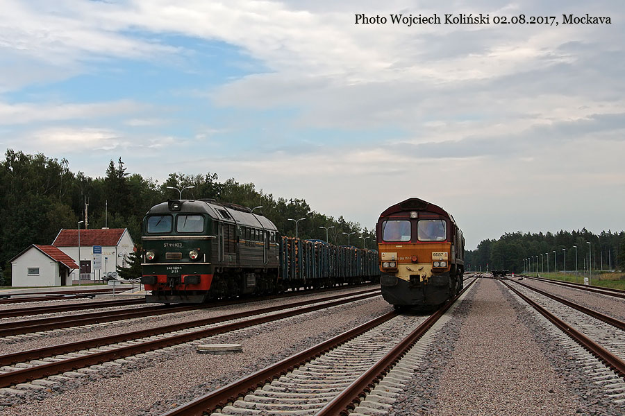 PKP Cargo ST44-1103 with the freight train Mockava (Lithuania) - Suwalki and Class 66157 02.08.2017, Mockava (Lithuania) Photo W. Kolins |