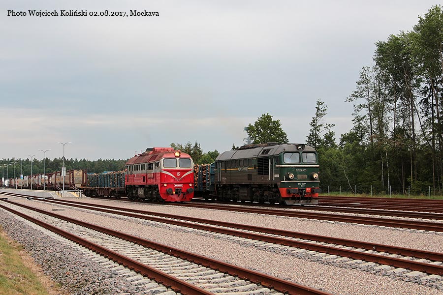 PKP Cargo ST44-1103 with the freight train Mockava (Lithuania) - Suwalki and M62K-1482 02.08.2017, Mockava (Lithuania) Photo W. Kolins |