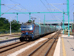 A private electric locomotive SIEMENS Smartron with number 91 52 10 80 025 - 5 , owned by private operator "Bulmarket" cross through railway station Pazardjik with freight train.