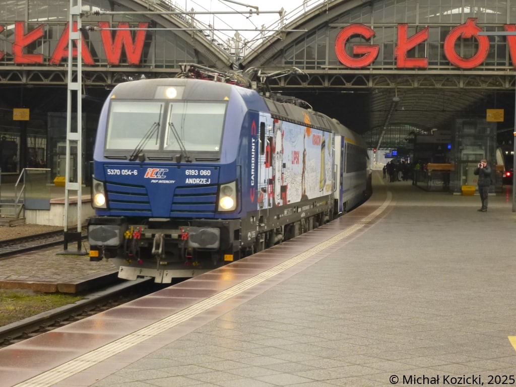 Cargounit 5 370 054-6 (6193 060) on lease to PKP IC departs from Wroclaw Gl. on the IC "Saxonia" service from Krakow to Leipzig Hbf, Poland, 20.12.2025.