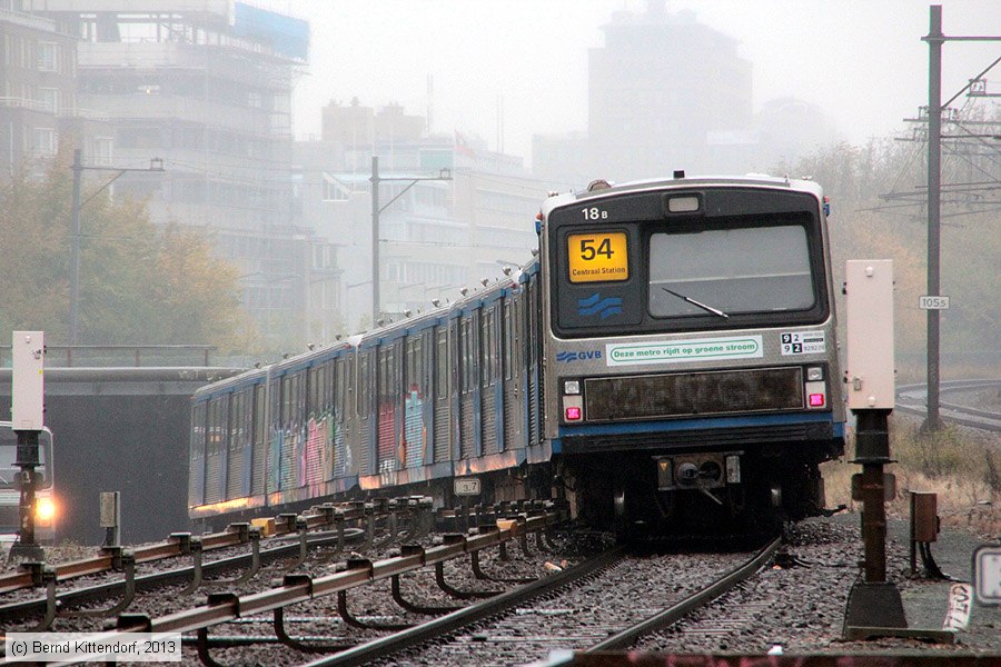 Metro Amsterdam - 18 Triebwagen 18 auf Linie 54 bei der Haltestelle Amstelstation vor der Fahrt in den Tunnel, aufgenommen am 12. November 2013.