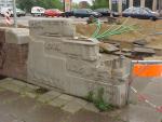 Ornament at the place where the former Weesperpoortstation in Amsterdam was located. A sequence of rolling stock, approx. a meter high is - with the streetname - the only thing left. But the railway history continues, as underneath the street behind the ornament the subway station 'Weesperplein' lies.