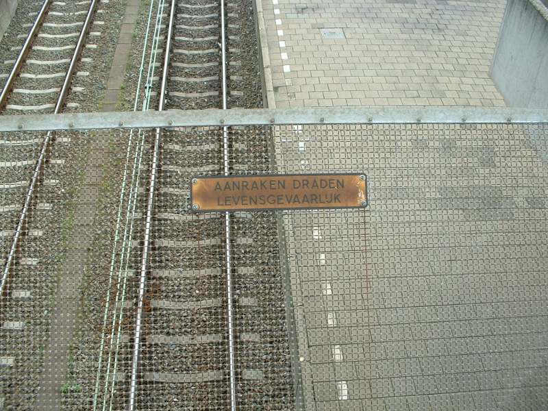 Sign above the tracks at The Hague Central; The sign says: Danger, do not touch wires