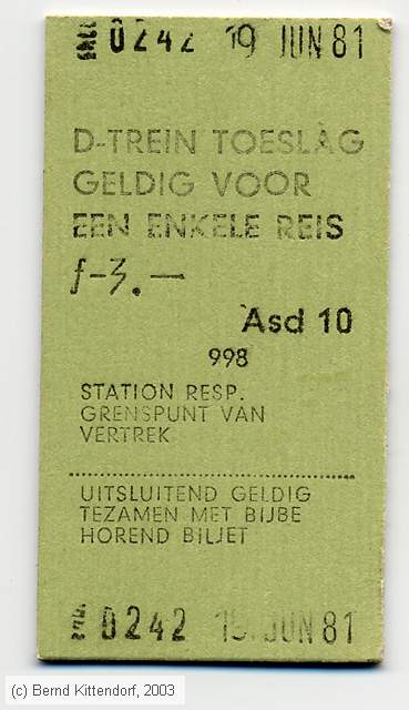 NS - Fahrkarten / Zuschlag D-Trein Toeslag vom 19.06.1981 (Niederlande).