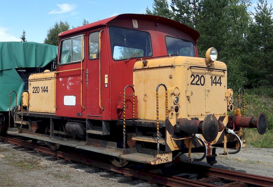| NSB Skd 220c 144. Built 1964 by Levahn, it has been assigned to move rolling stock of the railway museum. The Skd 220 shunters were built 1962 to 1973 in 85 units. Rolls-Royce C 6 SFL engine of 214 horsepower, length 7.6 m, weight 22 t, speed 45 km/h. Norsk jernbanemuseum, Hamar, 2023-07-18. |